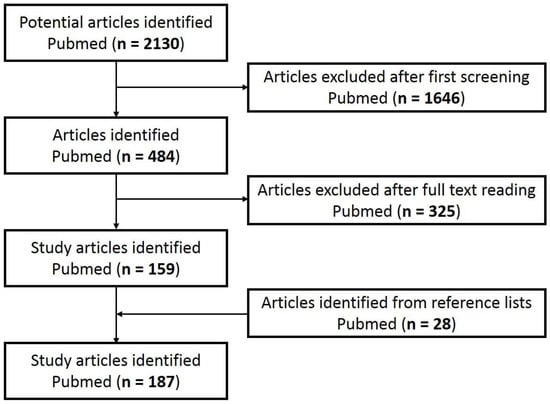 A systematic search for hallmarks, biomarkers of skin senescence, and senolytics was performed considering all the articles published until December 2022 through Medline using PubMed as the search engine. Manual research was completed at Miguel Hernandez University (UMH), Spain. The UMH bibliographic resource provided access to original manuscripts. A systematic search was performed using the keywords “cell”, “senescence”, “skin”, “senolytic”, “antioxidant”, “aging”, “biomarker”, “ROS”, “hallmark”, and “senotherapy”, using the operators AND OR between relevant keywords. Eligible abstracts were read to determine if they met the eligibility criteria, which consisted of being as recent as possible (before December 2022), being an original publication belonging to an indexed journal, and being aligned with the objective and theme of the review. Non-English or Spanish language publications were excluded from the present review. Filter limits (such as text availability, article type, and publication date) were not applied. Titles and abstracts that met the inclusion criteria were retrieved, and the full text articles were studied. Finally, 187 studies were selected for review (Figure 1).