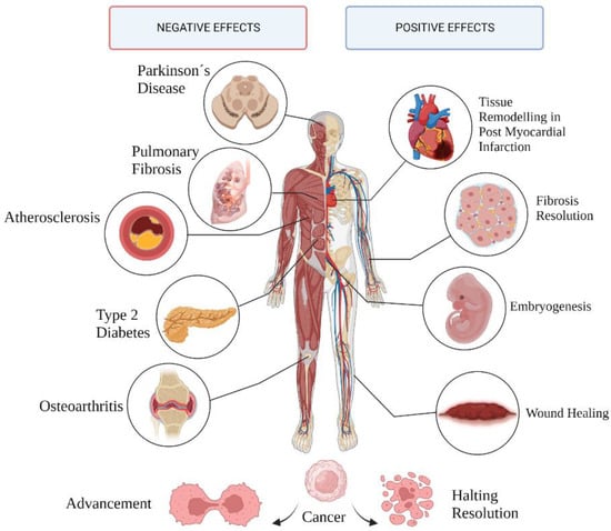Senescence is linked to several normal and pathological mechanisms involving tissue remodeling (Figure 2). While the initial, transient accumulation of senescent cells performs beneficial functions, it is a double-edged sword when persistent, negatively affecting surrounding cells, tissues, and the body as a whole.
