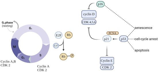 Cell cycle arrest is prompted by the p53/p21WAF1/CIP1 and p16INK4A/pRB tumor suppressor routes. p21WAF1/CIP1 acts downstream of p53, while p16INK4A acts upstream of pRB. Prolonged stress conditions may be a potential trigger for the activation of p16INK4a—a cell cycle regulator that acts as an inhibitor of CDK4/6 kinases [53]. This leads to arrest in the phosphorylation of RB, which in turn contributes to enduring cell cycle arrest. As long as p16INK4a is expressed, Rb proteins remain in a sustained hypophosphorylated state, stimulating attachment to E2F and cell cycle exit in G1 [54]. The overexpression of p16INK4a was detected in aging human skin, indicating a possible link between this suppressor protein and aging and senescence. Moreover, the upregulation of p16INK4a was observed in senescent fibroblasts in response to oxidative and DNA-damaging stressors.
