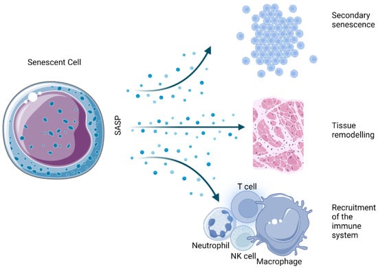 The bilateral nature of senescence is most evident with respect to its role in cancer [15]. The underlying mechanism of cell cycle arrest prevents the multiplication of cells with amassed DNA damage, which are later cleared out by immune cells, contributing to overall structural equilibrium [16,17]. Senescent cells tend to accumulate with age, most likely due to the inability of the aging immune system to promptly rid tissues of these cells, usually resulting in permanent damage [18]. Senescent cells can directly affect neighboring cells by secreting senescence-associated secretory phenotype (SASP) factors—an elaborate mixture of pro-inflammatory molecules, namely, cytokines, prostaglandins, miRNAs, and damage-associated molecular pattern proteins (DAMPs); chemokines attracting roving immune cells; and proteases capable of damaging the composition of the extracellular matrix (ECM). This secretory phenotype can create proinflammatory conditions favorable for cancer cell proliferation and expansion [19,20]. Nonetheless, the make-up of secreted SASP varies considerably according to cells and tissues, as well as the stimuli provoking the onset of senescence.
