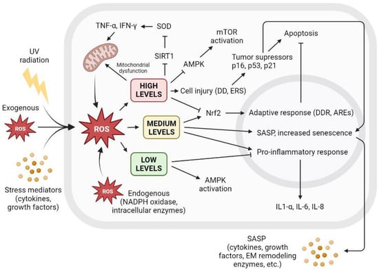 The level of intracellular ROS triggers adaptive response, apoptosis, or SASP. Intracellular ROS levels can vary depending on several factors, including extracellular factors such as exposure to UV radiation, high levels of oxidative stress, or proinflammatory environments with the presence of cytokines or growth factors. ROS are also produced intracellularly as part of normal cellular processes or at elevated levels derived from dysfunctional mitochondrial activity, as well as increased by NADPH oxidase activity or other intracellular enzymes. Low ROS levels activate AMPK and inhibit proinflammatory response. Low ROS levels do not promote cell senescence and contribute to redox homeostasis. Medium ROS levels activate Nrf2 and promote adaptive cellular response to fight ROS and prevent apoptosis, activate proinflammatory response, and increase SASP and its paracrine signaling, promoting cell senescence. High ROS levels cause mitochondrial dysfunctions that generate more ROS; inhibit AMPK, resulting in mTOR activation; and cause widespread cell damage by increasing cellular stress and the concentration of tumor suppressors and cell cycle arrest proteins, leading to apoptosis. AREs: AU-rich elements; AMPK: AMP-activated protein kinase; DD: DNA damage; DDR: DNA damage response; EM: extracellular matrix; ERS: endoplasmic reticulum stress; IFN-γ: interferon gamma; IL: interleukin; mTOR: mammalian target of rapamycin; NADPH: nicotinamide adenine dinucleotide phosphate; ROS: reactive oxygen species; SIRT1: sirtuin 1; SOD: superoxide dismutase; TNF-α: tumor necrosis factor alpha; UV: ultraviolet.