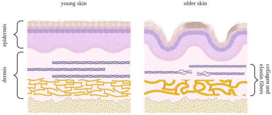 Skin aging is a highly complex process that has a negative effect on most features of normal skin morphology and function and is driven by both intrinsic and extrinsic factors. The intrinsic factors propelling skin aging include the natural passage of time, hormonal regulation, genetic predisposition, and gradual shifts in the cellular redox environment, while the extrinsic factors include environmental stresses such as extensive sunlight exposure and various kinds of pollution [151]. The thinning of the epidermis can be explained to a certain degree by the insufficient proliferative and restorative capacities of the basal epidermal layer as well as by a decrease in the pool of local stem cells. In addition to the epidermis, the dermal epidermal interface and dermis also become thinner (Figure 6) and less vascularized, limiting the access to nutrients and compromising skin homeostasis. Dermal fibroblasts secrete ECM elements, which are important for the structural cohesion and elasticity of the skin. Structural changes in and the degradation of the ECM occur throughout aging, presumably leading to the thinning of the skin, increased wrinkling, and diminishing skin resilience [152].
