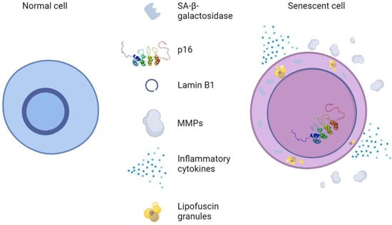 The hallmarks of senescence are a set of characteristics or alterations acquired by cells as they transition to senescent states, e.g., morphological changes. A “biomarker” (an amalgamation of “biological marker”), in its broadest sense, is a quantifiable measure of a certain biological parameter or condition that can be measured with a certain degree of accuracy and reproducibility. Biomarkers are often associated with hallmarks, e.g., wide and flattened cells, which are framed within morphological changes. Stephen Naylor defined a biomarker as “an umbrella coalescence term” and, more precisely, “a characteristic that is objectively measured and evaluated as an indicator of normal biological or pathogenic processes” [50]. Regarding the interpretation of biomarkers of aging, one of the first definitions was proposed by Baker et al. in 1988: a “biomarker of aging is a biological parameter of an organism that either alone or in some multivariate composite will, in the absence of disease, better predict functional capability at some late age, than will chronological age” [51].