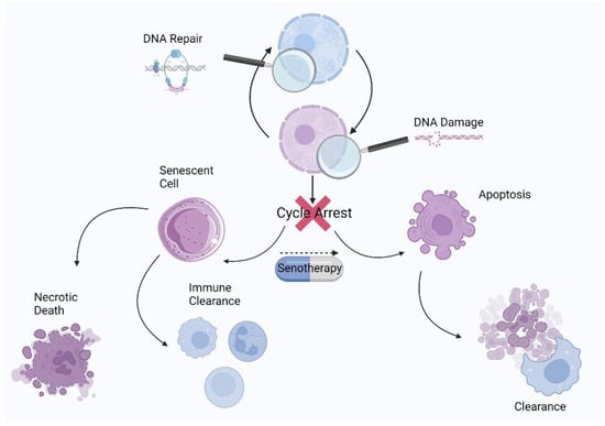 Schematic representation of the cell state after exit from the cell cycle and the role of senotherapy in senescence resolution.