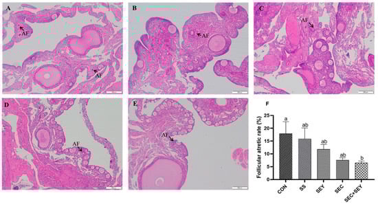 Effects of different Se sources on the histology of ovary in laying hens. (A–E) H&E staining of the ovaries. (A) the CON group; (B) the SS group; (C) the SEY group, (D) the SEC group, and (E) the SEC + SEY group. Scale bar = 200 μm. AF, atresia follicle. (F) Effects of different Se sources on follicular atretic rate. Data are means of 6 replicates per dietary treatment. Bars with different letters (a,b) indicate a significant difference (p < 0.05).