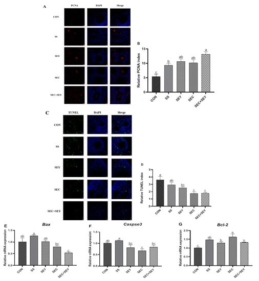 PCNA fluorescence staining was used to assess cell proliferation (PCNA-positive cells), while the TUNEL assay revealed cell apoptosis (TUNEL-positive cells). Hens fed the Se-supplemented diet had a higher (p < 0.05) relative PCNA index in ovarian tissue compared with those fed the CON diet (Figure 2A,B). The relative PCNA index in the SEC + SEY group was higher (p < 0.05) than that in the SS group. There was no difference in the relative PCNA index among the SEY, SEC, and SEC + SEY groups (p > 0.05). The TUNEL assay showed that dietary supplementation with SEY, SEC, and SEC + SEY decreased the relative TUNEL index of the ovary compared with hens fed the CON diet (Figure 2C,D). Similarly, dietary supplementation with SEC + SEY decreased (p < 0.05) the mRNA abundance of ovarian BCL2-associated X (Bax) compared with hens fed the CON, SS, and SEY diets (Figure 2E). Dietary SEC supplementation decreased (p < 0.05) ovarian Caspase 3 mRNA abundance in comparison with those fed the CON and SS diets (Figure 2F). Dietary Se supplementation increased (p < 0.05) the mRNA expression of B-cell lymphoma-2 (Bcl-2) compared with those fed the CON diet (Figure 2G). Moreover, SEC supplementation increased (p < 0.05) the mRNA expression of Bcl-2 compared with those fed the SEY or SEC + SEY diet.