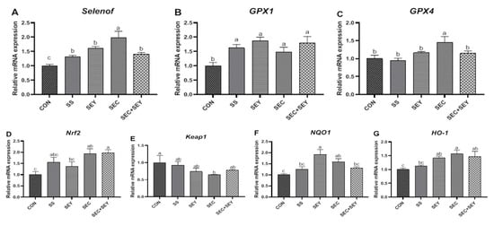 Relative mRNA expression of selenoprotein (A–C) and Nrf2/Keap1 pathway genes (D–G) in the ovaries of laying hens fed different Se sources. Data are means of 6 replicates per dietary treatment. Bars with different letters (a–c) indicate a significant difference (p < 0.05). Selenof, selenoprotein f; GPX1, glutathione peroxidase 1; GPX4, glutathione peroxidase 4; Nrf2, nuclear factor erythroid 2-related factor 2; Keap1, Kelch-like ECH-associated protein 1; NQO1, NAD(P)H quinone dehydrogenase 1; HO-1, heme oxygenase 1.