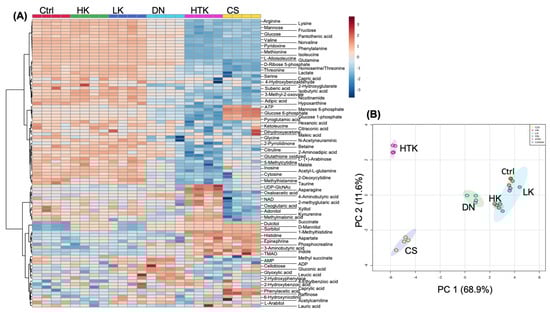 Effects of 5 Cardioplegic Solutions on Cellular Metabolism. AC16 human cardiac myocytes were seeded in 6-well plates and cultured in DMEM containing 12.5% FBS. When reaching 90% confluency, cells were placed in 0.5% FBS/DMEM/F12 for overnight serum starvation. The cells were treated with HK, LK, DN, HTK, and CS for 4 h before extraction of aqueous metabolites from cell lysates for LC-MS/MS-based metabolomics. The overall metabolic profile differences between control (Ctrl) and cells treated with a cardioplegia solution (n = 4) are shown in the heatmap (A) and by a principal component analysis (PCA) score plot (B).