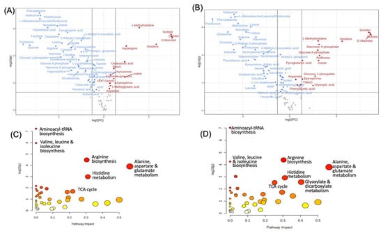 Metabolites and Metabolic Pathways Altered by HTK and CS. AC16 cells seeded in 6-well plates were used for the collection of aqueous metabolites as described in Figure 1 for LC-MS/MS-based metabolomics. A total of 67 or 65 metabolites showed statistically significant differences as determined by Student’s t-test (n = 4, p < 0.05) between control versus HTK or CS and are displayed in the volcano plots (A,B) generated by the MetaboAnalyst 5.0 software. The altered metabolic pathways are displayed with the x-axis representing the pathway impact score computed from pathway topological analysis and the y-axis being the -log10 of the p-value obtained from pathway enrichment analysis (C,D). The metabolic pathways perturbed by the HTK and CS treatment are displayed in the gradient from yellow to red, reflecting the p-value from statistical analysis, as shown in the y-axis, from non-significant (≤1 for −log10, p ≥ 0.1, light yellow) to significant (≥1 but ≤2 for −log10, p ≤ 0.01 to p ≥ 0.001, orange) to highly significant (≥2 for −log10, p ≤ 0.0001, red). The size of the circles reflects the number of metabolites altered in the metabolic pathway (C,D).