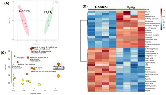 A significant separation of metabolic profiles was discovered between the Ctrl and H2O2-treated group by PCA (Figure 3A). The heatmap shows 35 metabolites that were significantly up- (16) or down- (19) regulated, as determined by the Student’s t-test with FDR correction (Figure 3B). Among the significantly decreased metabolites are NAD and acetylcarnitine (Figure 3B). Increased metabolites include glucose derivatives, i.e., glucose 6-P, glucose 1-P, fructose, mannose, and mannose 6-P. Several sugar alcohols in the pentose phosphate pathway also increased, including L-arabitol, adonitol, Ribose 5-P, and xylitol (Figure 3B). Pathway analyses revealed significant alteration of nine metabolic pathways by H2O2 treatment (p < 0.05): (1) nicotinate and nicotinamide metabolism; (2) pentose phosphate pathway; (3) TCA cycle; (4) amino sugar and nucleotide sugar metabolism; (5) pentose and glucuronate interconversions; (6) alanine, aspartate, and glutamate metabolism; (7) purine metabolism; (8) glycolysis; and (9) butanate metabolism (Figure 3C).