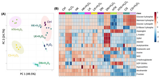 Effect of Cardioplegic Solutions on Metabolites Changed by H2O2 Treatment. AC 16 cells at 90% confluency were serum-starved in 0.5% FBS DMEM/F12 overnight. The cells were treated with HK, LK, DN, HTK, or CS for 3 h as described in the Section 2, followed by exposure to 200 μM of H2O2 for 1 h before extraction of aqueous metabolites by 80% methanol for LC-MS/MS-based metabolomics. K-means clustering shows the overall metabolic profile altered by H2O2 and pretreatment with each cardioplegia solution (A, n = 4). The heatmap displays the metabolites in the 9 metabolic pathways significantly altered by H2O2 treatment for all groups of comparisons (B, n = 4).