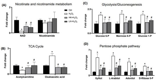 Compared with the Ctrl or H2O2-treated cells, pretreatment with HK or LK was able to shift the metabolic profile of H2O2-treated cells towards that of Ctrl (Figure 4A). Among the 17 metabolites of 9 significantly changed pathways due to H2O2 treatment, HK or LK pretreatment was able to block H2O2 from inducing increases or decreases in the majority of these metabolites (Figure 4B). Specifically, the decrease in NAD or acetylcarnitine was attenuated by HK or LK treatment (Figure 5A,B). H2O2-induced increases in glucose 6-P, glucose 1-P, mannose 6-P, and oxaloacetic acid were inhibited by HK or LK (Figure 5B,C). The increases in the metabolites in the pentose phosphate pathway, i.e., xylitol, L-arabitol, adonitol, and D-ribose 5-P, due to H2O2 treatment were prevented by HK or LK (Figure 5D). These data indicate the capacity of HK or LK for protection against metabolic shifts by oxidative stress.