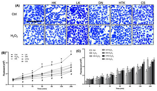 Effects of Cardioplegic Solutions on Cell Morphology and ROS Generation. AC16 cells were seeded in 6-well (A) or 96-well plates (B,C) for pretreatment with cardioplegic solutions for 3 h. After 1 h exposure to 200 μM H2O2, cell morphology was recorded under an inverted light microscope after fixing and staining in 0.1% Coomassie blue (A). Following pretreatment with a cardioplegic solution, the cells were incubated with 100 μM DCFH-DA for 30 min before recording ROS generation with 200 μM H2O2 treatment by a fluorescence microplate reader (B,C). The bar graphs represent the means ± SD from 4 replicates of one representative experiment (C). * indicates a significant difference (p < 0.05) of H2O2-treated cells from Ctrl or a cardioplegic-solution-treated cells, whereas # indicates a significant difference (p < 0.05) of Ctrl from DN-, HTK-, or CS-treated cells (B).