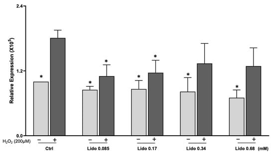 Lidocaine prevents ROS generation by H2O2. AC16 human cardiac myocytes were seeded in 96-well plates and were pretreated with indicated concentrations of lidocaine for 3 h before 30 min incubation with 10 μM DCFH-DA. H2O2 was added to the final 200 μM for recording the fluorescence of hydroxy radical formation. The bar graphs represent the means ± SD from 3 independent experiments. * indicates statistical significance (p < 0.05) from H2O2 -treated alone group as determined by two-way ANOVA.