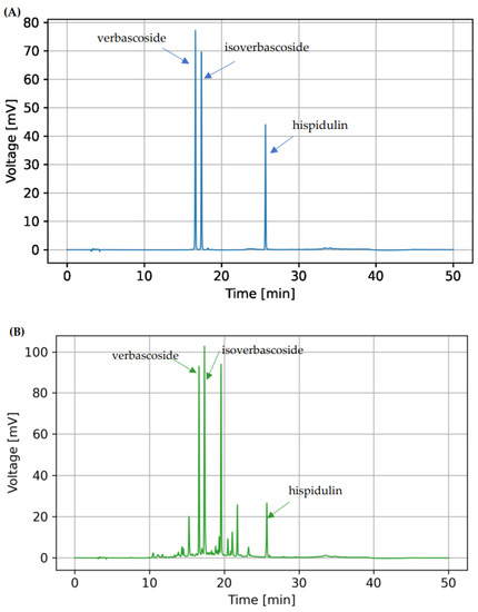 (A) HPLC chromatogram of verbascoside (5 µg/mL), isoverbascoside (5 µg/mL), and hispidulin (0.9 µg/mL) standards and (B) a HPLC chromatogram of 200 µg/mL C. chinense leaf extract.