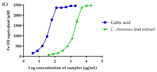 The ferric-reducing antioxidant powers of gallic acid and C. chinense leaf extract are presented in Figure 2C. The calibration curve of ferrous sulfate (Fe2+) indicated a good linearity within the range of 9.76–2500 µM (r = 0.9998). The FRAP value was expressed as an Fe2+ equivalent. The results showed that the FRAP value of gallic acid and C. chinense leaf extract increased with concentration. FRAP values of gallic acid and C. chinense leaf extract were in the range of 154.29 ± 1.77 to 2461.44 ± 30.00 µM and 88.73 ± 4.59 to 2480.81 ± 0.00 µM, respectively. These results suggested that the antioxidant activity of C. chinense extract involved a ferric-reducing capacity.