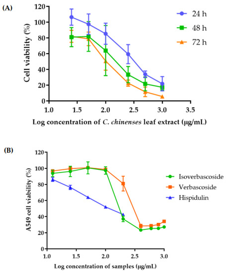 A549 cell viability after incubation with (A) C. chinense leaf extract for 24, 48, and 72 h and (B) verbascoside, isoverbascoside, and hispidulin for 24 h. Data are shown as the mean ± SD (n = 3).