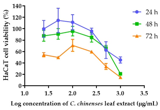 Effect of C. chinense leaf extract on HaCaT cell viability after incubation for 24, 48 and 72 h. Data are shown as the mean ± SD (n = 3).