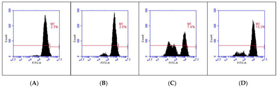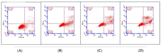 Flow cytometric analysis of early apoptosis, late apoptosis, and necrosis in A549 cells treated with C. chinense leaf extract. The dot plot represents the (A) untreated A549 cells; (B) A549 cells treated with 50 µg/mL C. chinense leaf extract; (C) A549 cells treated with 100 µg/mL C. chinense leaf extract, and (D) A549 cells treated with 250 µg/mL C. chinense leaf extract.