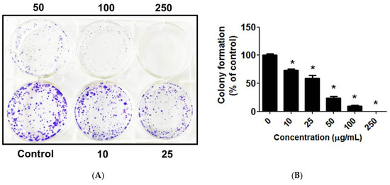 (A) Clonogenic formation of A549 cells treated with 0, 10, 25, 50, 100, and 250 µg/mL of C. chinense leaf extract, and (B) the percentage of colony formations of A549 cells treated with various concentrations of C. chinense leaf extract and untreated A549 cells. The data represent the mean ± SD of the three experiments with * p < 0.05.