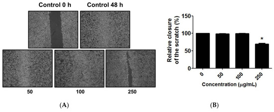 (A) Migration of untreated A549 cells and A549 cells treated with 50, 100, and 250 µg/mL C. chinense leaf extract, and (B) percentage of relative closure of the scratch of untreated A549 cells and A549 cells treated with 50, 100, and 250 µg/mL of C. chinense leaf extract. The data represent the mean ± SD of the three independent experiments with * p < 0.05.