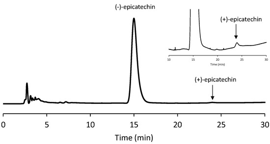 v)] at a 1.0 mL/ min flow rate for at least 40 min. The LC enantioselective analyses were run at 1.0 mL/min flow rate with a 40 °C column temperature, setting the wavelength of detection at 275 nm. To confirm the isomeric identity of epicatechin, the corresponding peak in the achiral HPLC chromatogram was isolated from all the investigated samples, evaporated to dryness, and then analyzed with the above enantioselective LC conditions after solubilization in the selected eluent system. As a result, a predominance (>99.5%) of (-)-epicatechin was always detected, thereby justifying the exclusive consideration of this isomer throughout the manuscript. However, for a sake of simplicity, “epicatechin” will be used from now on in the manuscript. An exemplary chromatogram of a chiral analysis is shown in