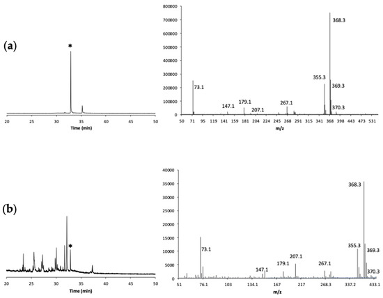 26]. The oven temperature was held at 90 °C for 1 min, then increased to 220 °C at a heating rate of 6 °C/min, then to 290 °C at 10 °C/min and held for 1.23 min, and finally to 310 °C at a rate of 40 °C/min and the temperature was held for 7.5 min. The total run time was 37.67 min. The detector temperature was 280 °C. The carrier gas used was helium at a flow rate of 1.0 mL/min. The injected sample volume was 1.0 μL. The conditions for electron impact ionization (EI) were an ion energy of 70 eV and the mass range scanned was 140–600