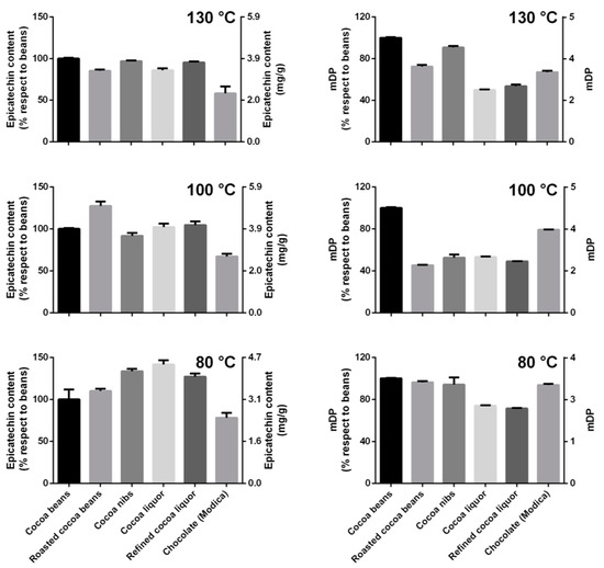 Figure 5). A decrease of the mDP value during the different steps of chocolate production would indicate a reduction of the polymerization degree of the oligomers that might contemplate the release and/or the rearrangement of monomers, such as epicatechin. It is speculated that this mechanism was responsible for epicatechin variation. In particular, the cocoa samples submitted to the mildest temperature program had an increase in epicatechin content that corresponded to a decrease in mDP (