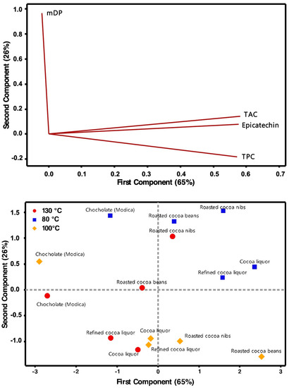 Figure 8 lower plot). The samples cluster according to their processing temperature. Samples treated at lowest roasting temperature are characterized by high values of PC1 and PC2, indicating an increase of polyphenols content and antioxidant activity, together with the oligomerization degree with respect to the initial samples. At intermediate temperature, there was still an average/high content of polyphenols and antioxidant activity, even if of less extent with respect to the sample treated at 80 °C, and a concomitant reduction of the oligomer length. Thus, the samples processed at 80 and 100 °C are well differentiated by the PC2. The samples processed at the highest temperature (130 °C) are instead clustered by the PC1 in a different plot area (lower left quadrant). In this case, all the samples showed intermediate or low values of PC1, indicating a reduction of the polyphenolic component.