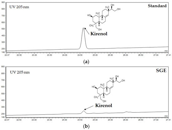 SGE was prepared at a concentration of 2 mg/mL in 50% methanol. Serial dilutions (2.5, 25, 125, 250, 500, and 1000 µg/mL) of the standard compound (kirenol) in methanol were prepared. HPLC was performed on an Ultimate 3000 LC system, using P580 and UVD100 detectors (Thermo Fisher Scientific Inc., Waltham, MA, USA). Chromatographic separation was performed on an Inno C-18 column (5 μm, 4.6 × 250 nm; Young Jin). The column temperature was 40 °C, the flow rate was 1.0 mL/min, the analysis time was 40 min, and the injection volume was 10 µL. To verify the validity of the method, the experiment was conducted based on the “Guideline for Validation of Test Methods such as Drugs” (Ministry of Food and Drug Safety).
