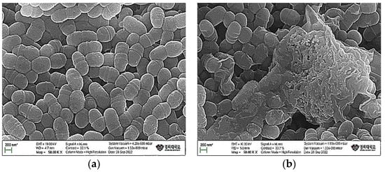 The cell wall is a rigid structure on the outside of the cell membrane and plays an important role in protecting the cell from the outside and maintaining its shape. After treatment of Streptococcus mutans KACC 16833 with SGE, morphological changes in the bacterial cell walls were observed using a scanning electron microscope. Untreated S. mutans KACC 16833 had smooth surfaces (Figure 2a), whereas S. mutans KACC 16833 treated with SGE exhibited severe cell wall destruction (Figure 2b).