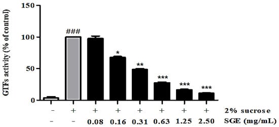 Inhibition of GTFs’ activity of SGE. GTFs’ inhibitory activity was measured using a spectrophotometer of water-insoluble glucan produced by S. mutans, using sucrose as a substrate. Glucosyltransferase was pretreated with the indicated concentrations of each sample for 24 h. Values are mean ± SD; ### p < 0.001 vs. non-treated group, * p < 0.05, ** p < 0.01, and *** p < 0.001 vs. 2% sucrose-treated group.