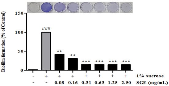 Inhibition of biofilm formation of SGE. Using 1% sucrose as a substrate, the biofilm-formation inhibitory effect of SGE on the biofilm produced by S. mutans was confirmed. After treatment at the indicated concentration for each extract, incubated for 24 h, the biofilm formation was measured using a microplate reader. Values are mean ± SD. ### p < 0.001 vs. non-treated group, ** p < 0.01, *** p < 0.001 vs. 1% sucrose-treated group.