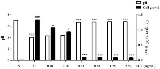 Inhibition of acid production of SGE. After treating S. mutans with the indicated concentration of SGE for 24 h, the amount of acid production was measured using a pH meter, and bacterial growth was measured using a spectrophotometer. Values are mean ± SD; ### p < 0.001 vs. non-treated group, * p < 0.05, and *** p < 0.001 vs. 1% sucrose-treated group.