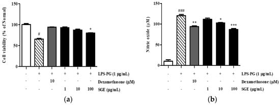 Cell viability and NO production in LPS-PG-induced PDLF cells treated with SGE. Effect SGE on cell viability (a). Effect of SGE on NO production (b). Dexamethasone was used as a positive control. Values are mean ± SD; # p < 0.05, ### p < 0.001 vs. non-treated group, * p < 0.05, ** p < 0.01, and ***p < 0.001 vs. LPS-PG-treated group.