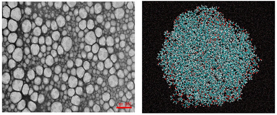 (Left) TEM microphotograph (15,000×) of stained (uranyl acetate) 1:9 (v:v) oil-in-water nanoemulsions, stabillized with Tween 80, ΦI = 0.0378. (Right) Snapshot of an emulsion droplet obtained through computer simulation (water is omitted for clarity).