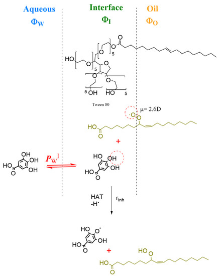 Two-dimensional representation of an emulsion droplet showing the aqueous, interfacial and oil regions and the chemical structures of the surfactant Tween 80, the antioxidant gallic acid GA and that of a peroxyl radical. The orientation of the reactants is illustrative. GA is oil-insoluble and only distributes itself between the aqueous and interfacial regions. The inhibition reaction (HAT mechanism) of GA with the peroxyl radicals mainly takes place in the interfacial region of the emulsion and through the HAT mechanism [42].