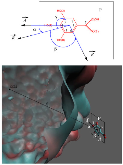 The spatial distribution of GA is described in terms of the distance along the vector from COM of GA to the COM of the nanoemulsion droplet, as illustrated in Figure 3. The relative orientation of GA in the nanoemulsion is described with the aid of the angles α, β and γ, Figure 3. The angle α stands for that between the vector and the line defined by the atoms O(4)-C4-C1-C7, which is contained in plane P of the aromatic ring of GA (vector ). The β angle defines that between vector and vector (joining the COM of GA and the C6 atom). The γ angle refers to that between vector and the molecular plane, P. Thus, when the plane of the aromatic ring is parallel to the droplet surface then γ = 90 °C, while when perpendicular then γ = 0 °C.
