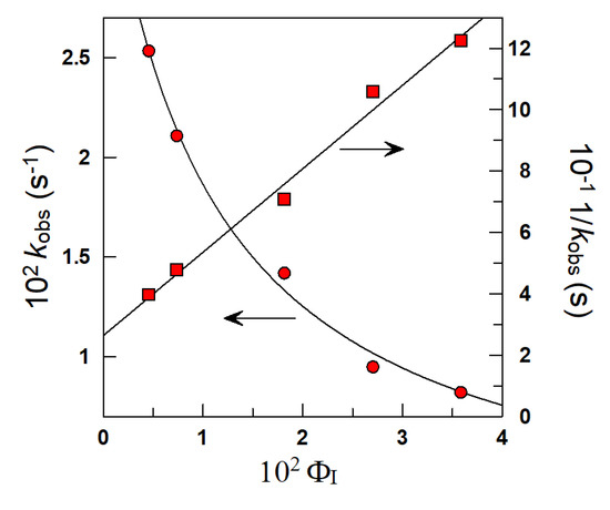 Variation of the observed rate constants with the emulsifier volume fraction (ΦI) for the reaction between chemical probe and GA in 1:9 (O/W) nanoemulsions. pH = 3.65 (citric-acid-citrate buffer 0.04 M), Tween 80, [16-ArN2+] = 1.4 × 10−4 M, [NED] = 0.02 M, [GAT] =3 × 10−3 M, T = 25 °C.