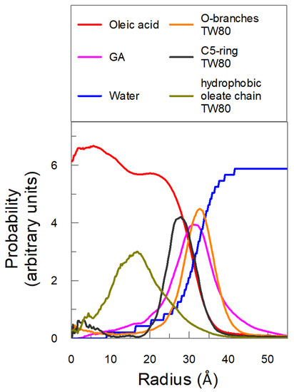The location and partitioning of GA were determined in silico by employing molecular dynamics (MD) simulations. An MD production run of 200 ns was computed with eight molecules of GA located randomly in the interfacial region (see Section 3.6) and the spatial configuration of the emulsified system was stored for analysis every 2 ps. Figure 5 shows the variation in the probability of finding oleic acid, Tween 80, water and GA molecules with the distance from the COM of the oil core of the nanoemulsion droplet (R).