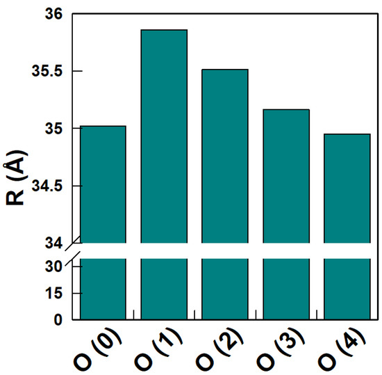 Considering these results and also those of the obtained distances, we can predict two possible orientations for gallic acid with almost the same probability to appear. The first one is that the O(3) and O(4) atoms are pointing (more or less) to the COM of the nanoemulsion droplet. The second one is that the O(0) atom (instead of the O(3)) is the one pointing to the center of the oil core of the nanoemulsion droplet. Nonetheless, we have to bear in mind that both possible conformations are exchanging continuously; an exchange that is favored by the fact that in both conformations the orientation of the molecular plane with respect to the surface of the nanoemulsion droplet is quite flexible (see Supplementary Materials, Figures S1 and S2).