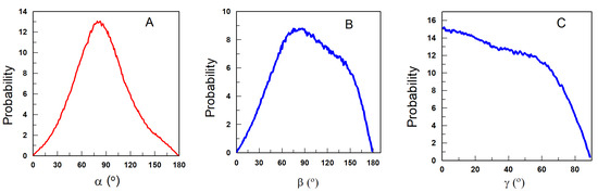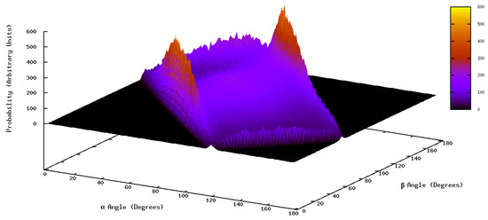 When analyzing the combination of the distribution functions of angles α and β, Figure 8, results indicate that there are two separate regions, each one including a maximum of probability. The first one corresponds to α = 55.5 degrees and β = to 64.5 degrees, the second one to α = 82.5 degrees and β = 154.5 degrees. The analysis reflects how each angle changes from its most probable position to find the best combination for both angles, that is, how the values of the angles at the maxima change with respect to those obtained in the distribution of each angle alone.