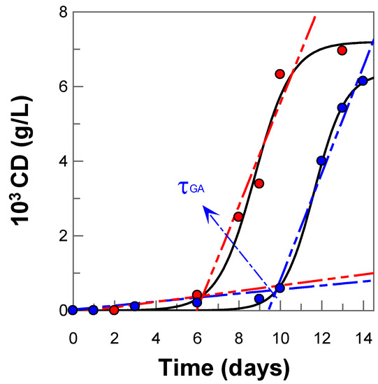The kinetic curves of the accumulation of conjugates dienes were obtained by plotting variations in the formation of CD with time. The oxidative stability of emulsion was quantified by determining the induction time (τIND) in the absence and in the presence of GA [15]. τIND is the critical time at which the transition from the initiation to the propagation stage takes place, and was determined, as in previous works, by the intersection point of the two straight lines during the induction period and the propagation step of the reaction [15,16].