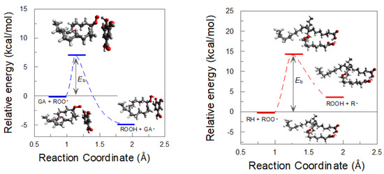 We also determined the energy barrier for the reaction between the peroxyl radical ROO● and oleic acid, finding that no significant energy differences were found for the two allylic C-H bonds, resulting in an energy barrier of 14.1 kcal/mol, which is approximately two times higher than that for the H abstraction from GA (7.0 kcal/mol), Figure 11.