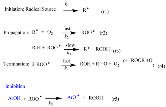 Basic steps (r1–r4) of the chain reaction in the oxidation of an unsaturated lipid (R-H). The inhibition reaction (r5) takes place upon the transfer of an H atom of a phenolic antioxidant (ArOH) to the chain carrying ROO● radicals. R●, ROO● and RO● stand for alkyl, alkylperoxyl and alkoxyl radicals.