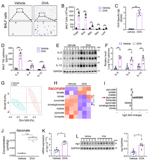 Itaconate level and Irg1 expression are induced in OVA−induced allergic airway inflammation. (A) Representative images of BALF cells stained with Wright–Giemsa solution. Scale bar: 50 μm. (B) The number of total inflammatory cells, eosinophils, macrophages, neutrophils and lymphocytes in BALF. (C) The optical density value (OD value) measured at 450 nm represents the level of IgE in serum. (D) The level of Th2 cytokines IL-5, IL-4 and IL-13 in BALF. (E) Representative blots showing the protein expressions of Th2 cytokines IL-5, IL-4 and IL-13 in lung tissues from vehicle and OVA groups. (F) Quantification of the expression of IL-5, IL-4 and IL-13 in the lung as referencing to GAPDH. (G–J) TCA organic acid metabolomics analysis in vehicle and OVA group. n = 3 per group. (G) Principal component analysis (PCA) in vehicle and OVA group. (H) Heatmap of metabolites obtained by TCA organic acid metabolomics analysis in vehicle and OVA group. (I) Fold change of metabolites in OVA group as compared with vehicle group. (J) The level of itaconate in lung tissue. (K) The mRNA expression of Irg1 in lung tissue. (L) Representative blots showing the protein expressions of Irg1 in lung tissues from vehicle and OVA groups and quantification. Cropped blots are shown, and Supplementary File S2: Figures S1 and S2 present the full-length blots. Data expressed as means ± SEM (n = 6). ** p < 0.01.