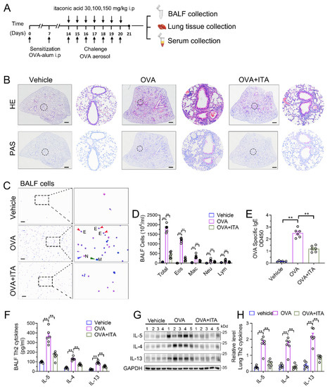 Exogenous itaconate attenuates OVA−induced allergic airway inflammation. (A) Protocol for the establishment of OVA-induced allergic airway inflammation and treatment of itaconate. (B) Representative whole lung sections stained with HE and PAS, scale bar: 500 μm. A magnified version of the panel can be found in Supplementary File S1: Figure S3. (C) Representative images of BALF cells stained with Wright–Giemsa solution. E: red arrows indicate eosinophils, M: green arrow indicates macrophage and N: blue arrow indicates neutrophil. Scale bar: 100 μm. (D) The number of total inflammatory cells, eosinophils, macrophages, neutrophils and lymphocytes in BALF. (E) The optical density value (OD value) measured at 450 nm represents the level of IgE in serum. (F) The level of Th2 cytokines IL-5, IL-4 and IL-13 in BALF. (G) Representative blots showing the protein expressions of Th2 cytokines IL-5, IL-4 and IL-13 in lung tissues from vehicle, OVA and OVA+ITA groups. (H) Quantification of the expression of IL-5, IL-4 and IL-13 in the lung as referencing to GAPDH. Cropped blots are shown, and Supplementary File S2: Figure S3 presents the full-length blots. Data expressed as means ± SEM (n = 6). ** p < 0.01.