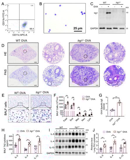 To further confirm the role of itaconate in AAI mice, mice deleted of Irg1, the enzyme which expression is reportedly correlated with the intracellular itaconate level [4], was generated (Supplementary File S1: Figure S4A). The homozygous Irg1−/− mice were confirmed by PCR (Supplementary File S1: Figure S4B). Additionally, we used primary AMs from the BALF to detect the protein expression of Irg1 in Irg1−/− mice. AMs were isolated and the purity was confirmed by flow cytometry (Figure 3A) and Wright Staining (Figure 3B). Western blots demonstrated that OVA markedly induced the Irg1 protein expression in OVA-stimulated AMs, which was absent in Irg1−/− AMs (Figure 3C).