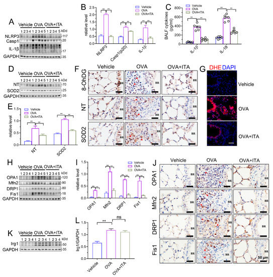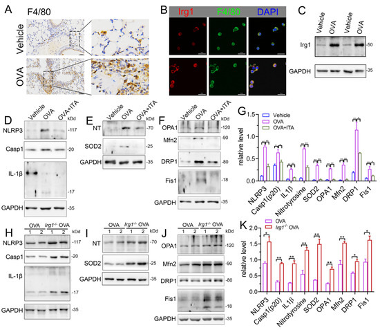 Itaconate inhibits the activation of NLRP3 inflammasome, oxidative stress and mitochondrial fusion/fission in BALF alveolar macrophages. (A) Representative lung sections of the immunohistologic staining of F4/80 in vehicle and OVA mice; scale bar: 50 μm. (B) Representative double immunofluorescent staining of F4/80 and Irg1 in BALF AMs from vehicle and OVA group. Scale bar: 20 μm. (C) Representative blots of Irg1 in BALF AMs from vehicle and OVA mice. (D) Representative blots of NLPR3, Caspase-1 (p20) and IL-1β (p17) in BALF AMs from vehicle, OVA and OVA+ITA mice. (E) Representative blots of nitrotyrosine (NT) and SOD2 in BALF AMs from vehicle, OVA and OVA+ITA mice. (F) Representative blots of OPA1, Mfn2, DRP1 and Fis1 in BALF AMs from vehicle, OVA and OVA+ITA mice. (G) Quantitative analysis of NLPR3, Caspase-1 (p20), IL-1β (p17), nitrotyrosine (NT), SOD2, OPA1, Mfn2, DRP1 and Fis1 in AMs from vehicle, OVA and OVA+ITA group. (H) Representative blots of NLPR3, Caspase-1 (p20) and IL-1β (p17) in BALF AMs from OVA and Irg1−/− OVA mice. (I) Representative blots of nitrotyrosine (NT) and SOD2 in BALF AMs from OVA and Irg1−/− OVA mice. (J) Representative blots of OPA1, Mfn2, DRP1 and Fis1 in BALF AMs from OVA and Irg1−/− OVA mice. (K) Quantitative analysis of NLPR3, Caspase-1 (p20), IL-1β (p17), nitrotyrosine (NT), SOD2, OPA1, Mfn2, DRP1 and Fis1 in AMs from vehicle, OVA and OVA+ITA group. For Western blot, n = 3 per group, each replicate pooled cells from three to five mice in vehicle and OVA+ITA group, while in OVA and Irg1−/− OVA group, each replicate represented one mouse; before seeding, the cell number was counted to ensure that the adherent AMs number will be no less than 2.5 × 105 cells/well. Cropped blots are shown, and Supplementary File S2: Figures S13–S23 presents the full-length blots. * p < 0.05, ** p < 0.01.