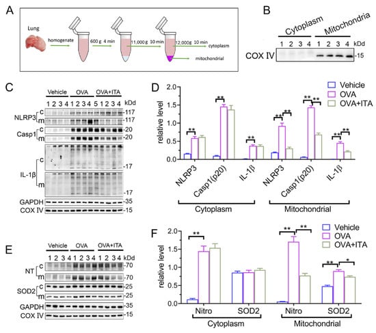 It has been suggested that mitochondrial reactive oxygen species (mtROS) have been implicated in NLRP3 activation [30], and the mitochondrial localization of NLRP3 precedes the inflammasome activation [31]. We therefore separated the lung tissue into mitochondrial and cytosolic fractions (Figure 5A), and this separation was successful, as the expression of COX IV was exclusively found in the mitochondrial fraction (Figure 5B). Then, we found that the expression of NLRP3 and mature IL-1β (p17)/Caspase-1 (p20) in the mitochondrial and cytosolic fractions were both significantly increased in OVA-challenged mice (Figure 5C,D). Additionally, the abundance of nitrotyrosine in the mitochondrial and cytosolic fractions was also both significantly increased in OVA-challenged mice, while the expression of SOD2 was only increased in the mitochondrial fraction (Figure 4E,F). However, only the mitochondrial NLRP3 inflammasome activation and mitochondrial oxidative stress were inhibited by the itaconate treatment (Figure 4C–F), suggesting that mitochondria are the primary targets of itaconate when exerting its protective effect on AAI. Consistently, the administration of MitoTEMPO, a mitochondria-targeted ROS scavenger, significantly attenuated the OVA-induced AAI (Supplementary File S1: Figure S5), NLRP3 inflammasome activation, oxidative stress and mitochondrial fusion/fission (Supplementary File S1: Figure S6).